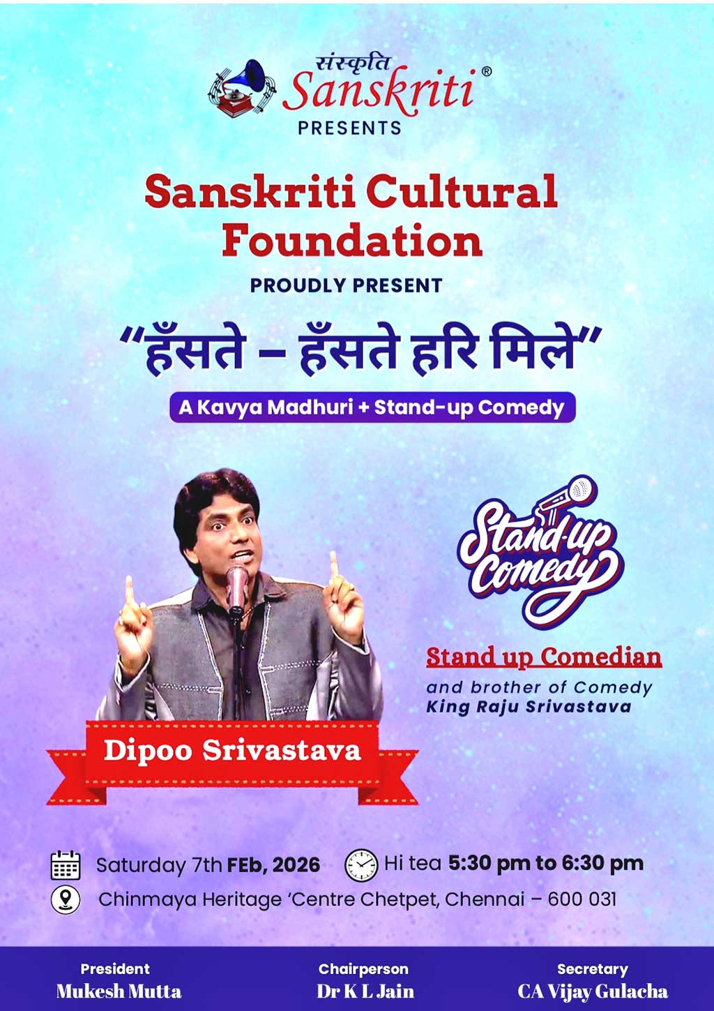Dipoo’s style of comedy is based mainly on current affairs, scenarios and situations performing both in India and also abroad. He has performed in reputed venues like Dubai, Muscat, Singapore, Bangkok, Hongkong, China, Fiji, Nepal and Mauritius performing incessantly in more than 2500 shows.